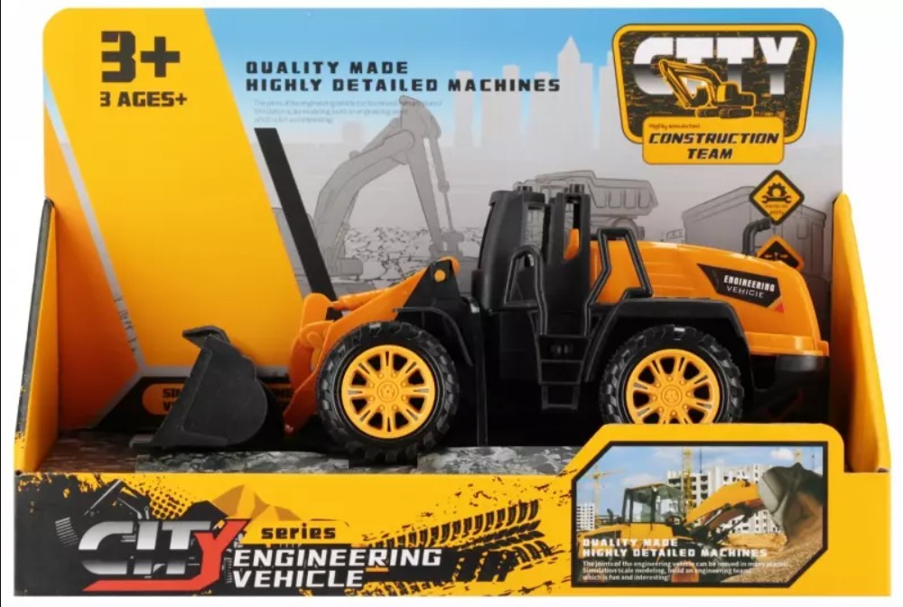 Description : véhicule jouet (bulldozer / camion-poussoir) avec fonction pull-back (traction à remontoir), lame/élément avant mobile, emballage en boîte avec fenêtre ; modèle Mega Creative (référence produit/code EAN).
