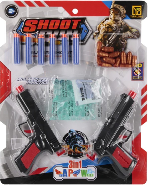- Description : pistolet jouet polyvalent permettant de tirer soit de l'eau, soit des fléchettes en mousse ; ensemble comprenant 2 pistolets, 6 fléchettes en mousse, des projectiles/balles d'eau et 11 munitions ; poignée ergonomique, mécanisme de tir simple, emballé sur blister.