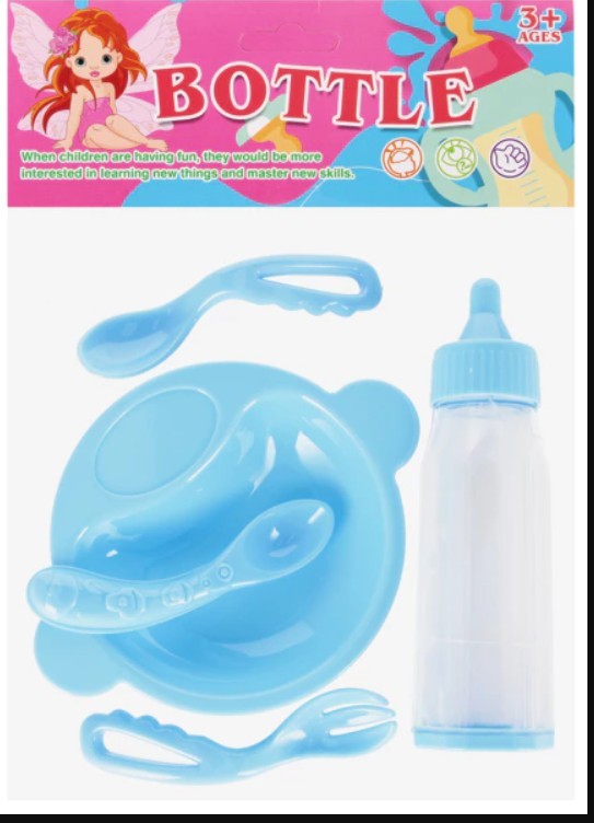 Description : ensemble d’accessoires pour poupée (biberon avec liquide simulant du lait, un bol, 2 petites cuillères) — biberon simulant la prise de lait en se renversant.