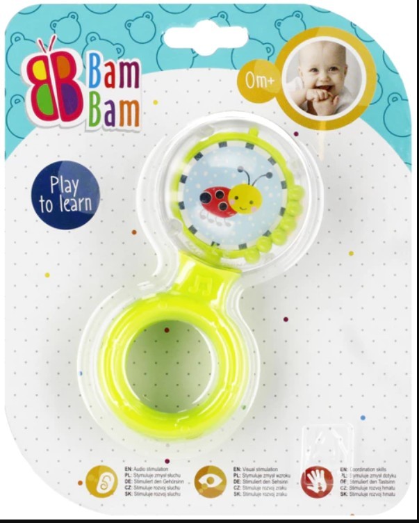 Le hochet Bam Bam Ball est conçu pour les bébés dès la naissance. Ce hochet, avec sa texture unique et sa forme variée, possède des éléments interactifs qui encouragent votre enfant à jouer tout en stimulant le développement de sa vue, de son ouïe et de sa motricité. Sa poignée stable assure une prise en main facile pour les petites mains. Dimensions / Piles : Dimensions du produit (L x H x P) [cm] : 6 x 12 x 6 Fonctionne sans piles. Jouet destiné aux enfants dès la naissance. Emballé sous blister.